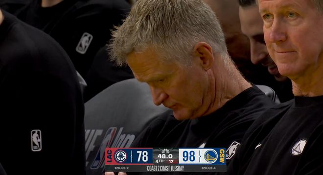 接下来鬼才卢指导撤下哈登伦纳德两大核心,换上保罗洛佩斯科林斯等替补,这波变阵无疑让快船更加雪上加霜,攻防两端陷入混乱,此时勇士三分再度回暖,快船单节让勇士打了一个32-14,三节落后63-78。
